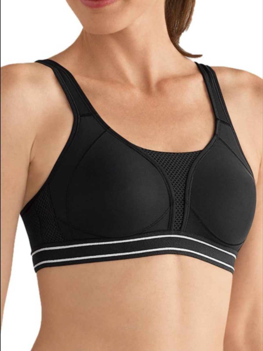 A medium control sports bra with bilateral pockets. With mesh side & back panels for moisture control and adjustable strap for comfort.