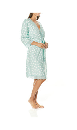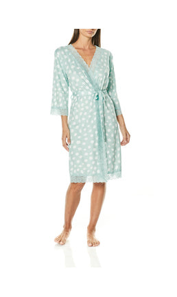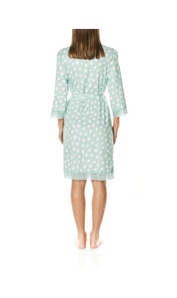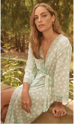 This beautiful silky robe has a simple and relaxed fit. The lace detail is super soft against the skin. The soft mint colour is beautiful, feminine and fashionable with the geo spot. At just the right length this robe is a fabulous fit.