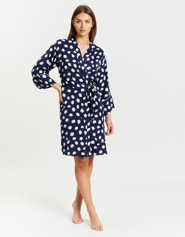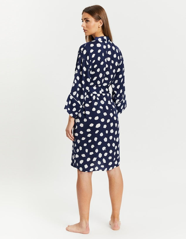 This very light weight robe feels like silk. . This robe is a great combo of classic navy and white.. you cant go wrong. Throw it over solid colours like grey, navy, white or match it with the Viola Chemise for a fabulous twin set. The robe is a relaxed fit with a beautiful sleeve length and large cuff making it so sophisticated. The length is just right. The perfect dress for those lounge days.