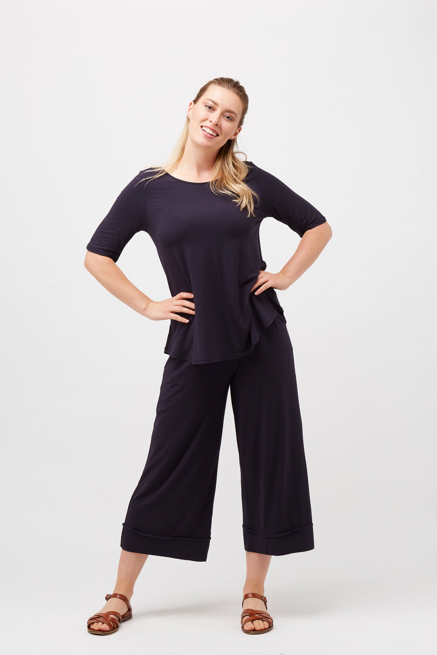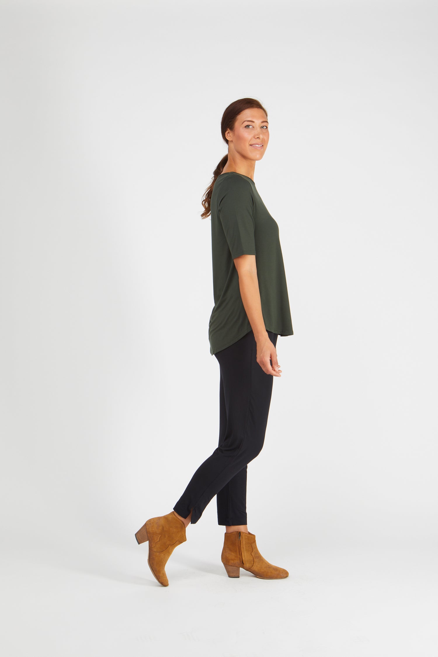 Tani introduces a new off the body swing tee! Slightly higher elegant neckline front and back. With a longer short sleeve finishing just above the elbow this style shows off a lovely detail at the shoulder too!
