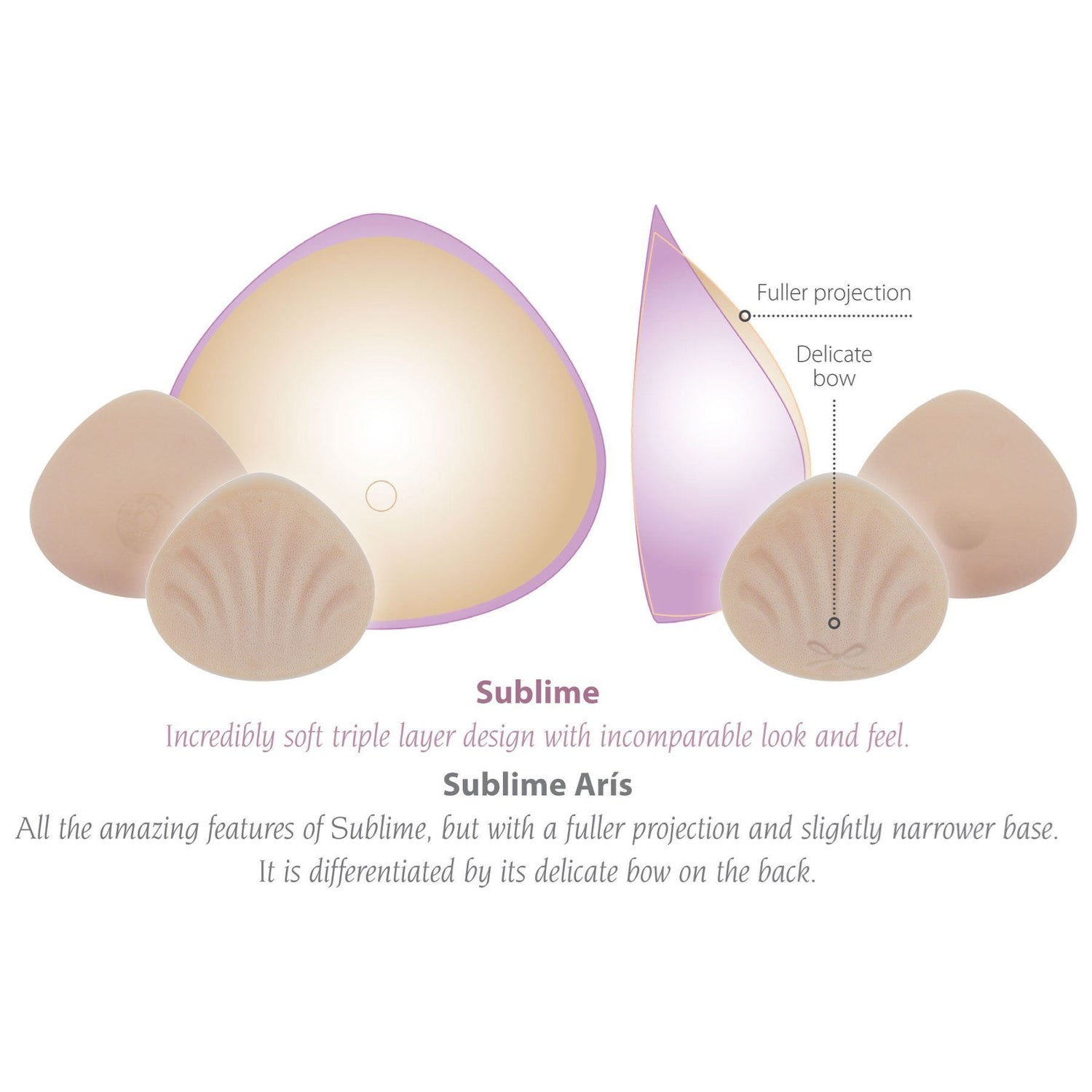 Our lightest ever breastform in 100% natural silicone, the Trulife Sublime Aris sets a new standard of comfort and natural feel. This form features an enhanced soft feel and shape for an intimate fit and a delicate bow design on the back.